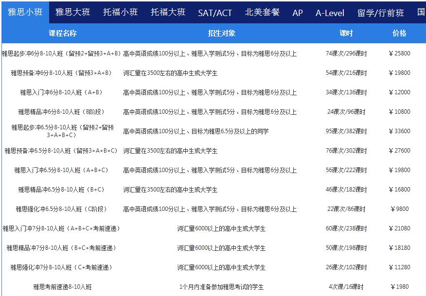 本课程针对有一定英语基础,想要取得雅思6.5分的学员开设,多个雅思班型,30人小班授课,保证每位学员学习到实用的知识,大家的词汇量不同,学习的班型也就不同,所以,我们不同的班型,课时和价格是不同的,欢迎大家前来试听和学习。